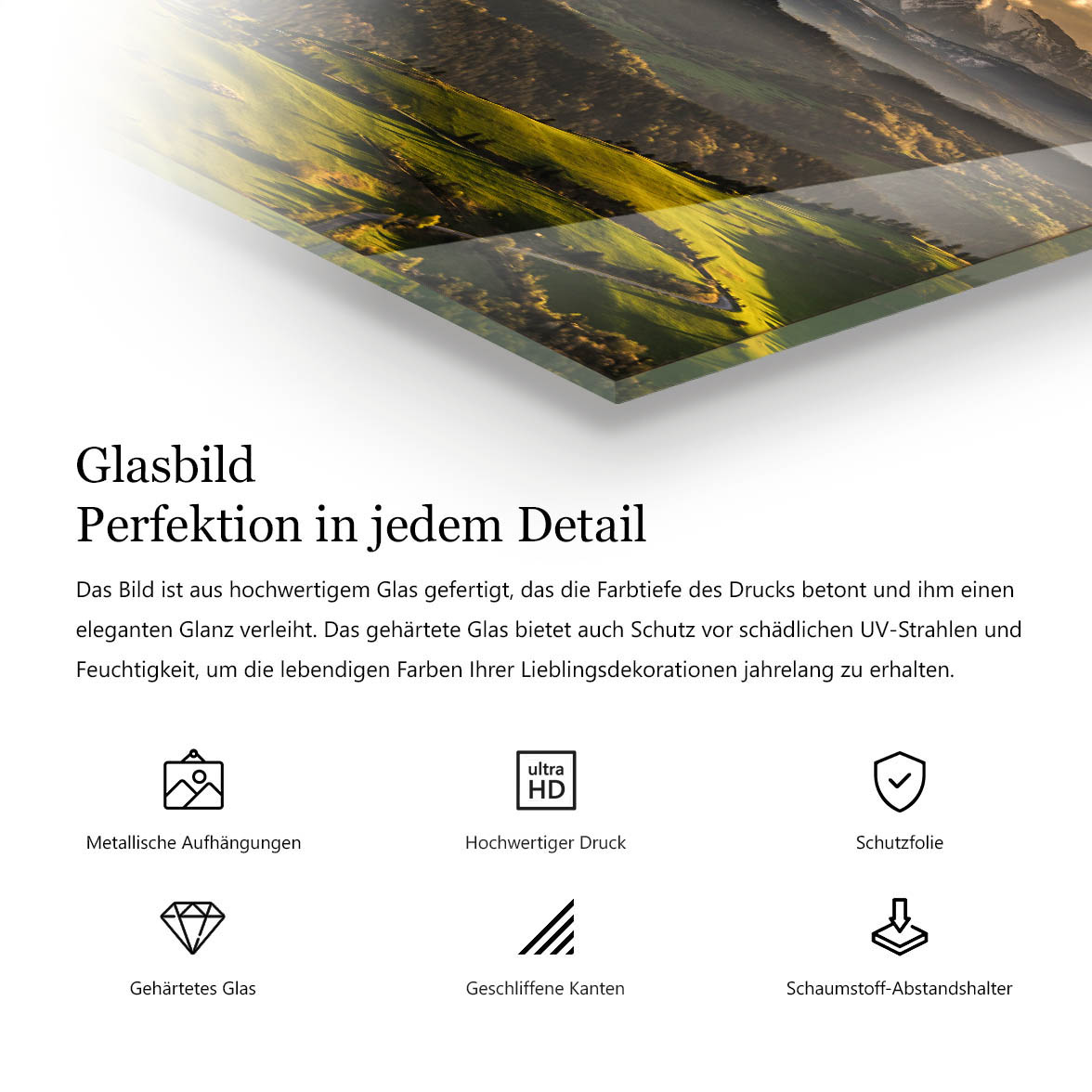 Das Glasbild besteht aus 4 mm starkem, gehärtetem Glas, das für seine Robustheit, UV-Beständigkeit und Feuchtigkeitsresistenz bekannt ist. Die glatte Oberfläche ist leicht zu reinigen und bewahrt über viele Jahre hinweg ihre brillante Optik.