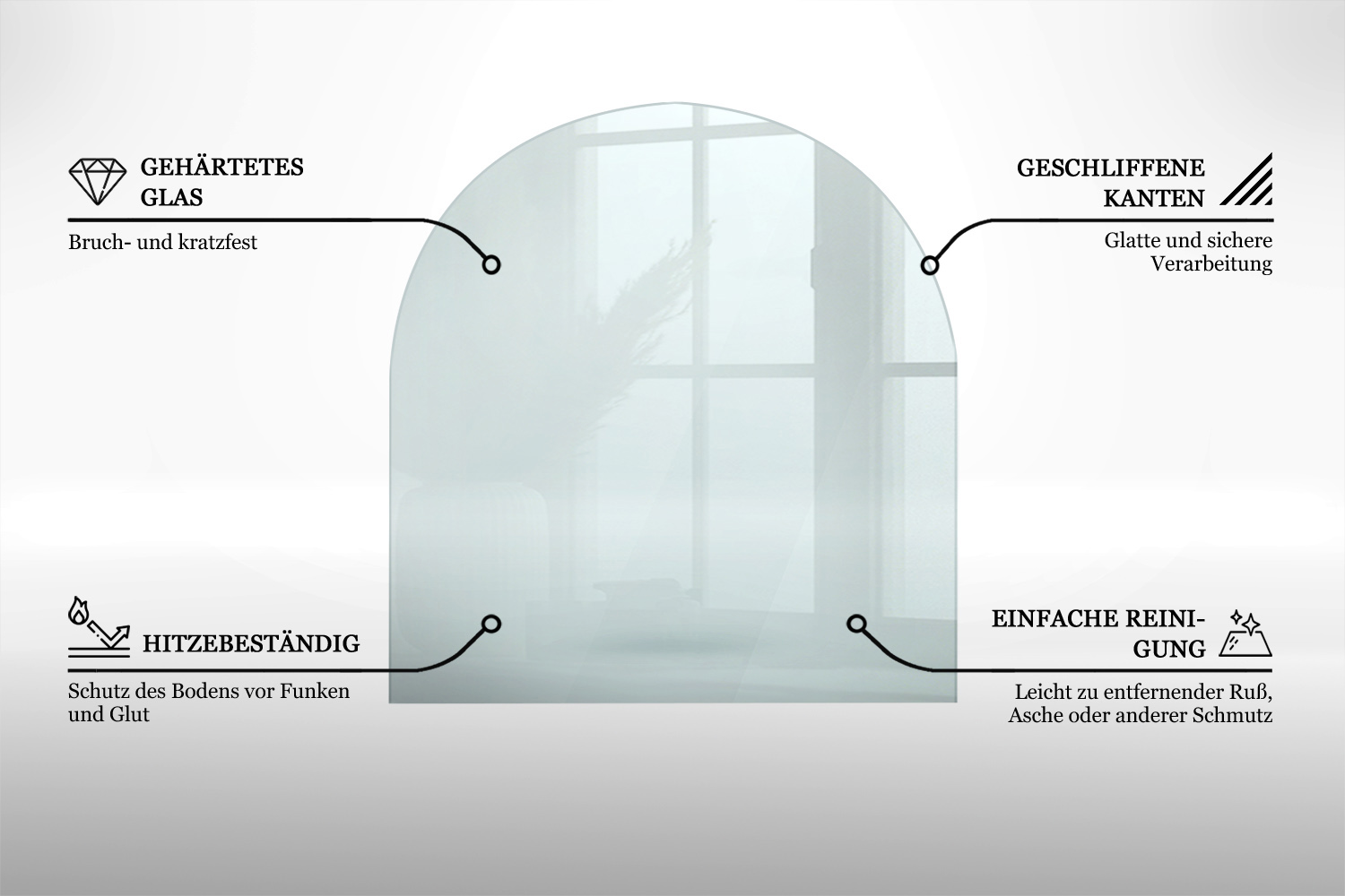 Als dekoratives Element wirkt die Glasplatte für Öfen halbrund transparent im Wohnzimmer oder Wohnbereich besonders eindrucksvoll. Sie sorgt für Ordnung, Ruhe und einen eleganten Gesamteindruck. Ihr universelles, transparentes Design harmoniert hervorragend mit Holz, Stein, Metall und modernen Oberflächen und betont den raffinierten Charakter der Einrichtung.